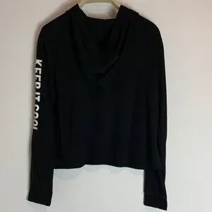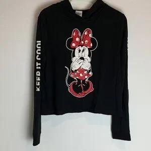 Charming Disney sweatshirt featuring Minnie Mouse. Black fabric with red bow and polka dot details. "Keep It Cool" text on sleeve.