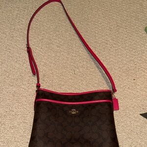 Stylish Coach crossbody with signature brown design and vibrant pink trim. Perfect for daily wear.