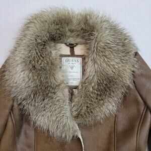 Guess Brown Faux Leather Knee Length Coat Faux Fur Collar Zip Pockets Small