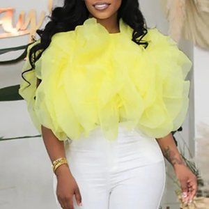 Bring the drama with this yellow ruffle tulle crop top blouse – a bold statement piece perfect for fashion-forward looks. Designed with layers of lightweight ruffled tulle and a cropped silhouette, this blouse adds instant flair to high-waisted pants, skirts, or evening wear. A must-have for parties, events, or standout street style.