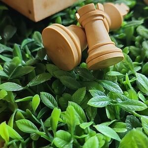 Vintage, carved wooden chess pieces are housed inside a wooden box with lid.