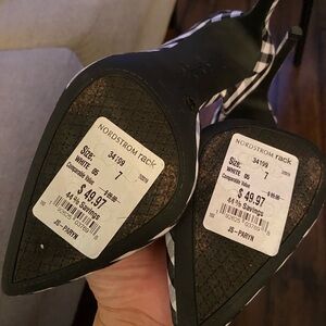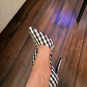Elegant gingham pattern Jessica Simpson heels, size 7. Black and white design. Perfect for stylish outings, jeans, holiday parties. I purchased and never wore, they’ve been sitting in my closet. The inside of the right shoe has some damage to the inner lining. If you can see past that these shoes are yours. Firm on price. Check out my closet, and shoes.