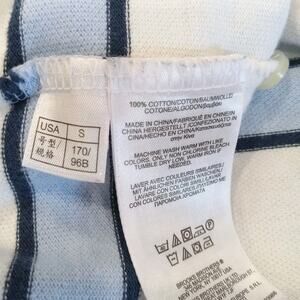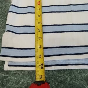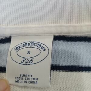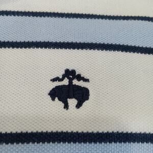 This Men's Brooks Brothers Stripe Polo Style Shirt in size large 346 features a collared neckline, pullover closure, and short sleeves made of 100% cotton. The shirt is designed for casual occasions and is woven with a classic striped pattern in blue and white striped color. It is easy to care for, breathable, and suitable for all seasons. This slim-fit polo shirt is accented with the Brooks Brothers logo, embodying a classic and preppy style perfect for everyday wear.