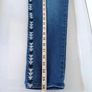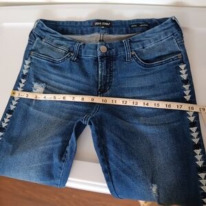 Dear John pants Joyrich Comfort skinny, size 29, geometric embroidery on sides, mid rise, denim, stretch, 95% cotton, 3% polyester, 2% spandex, 27 inseam, 5 slip pockets, in good condition.