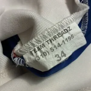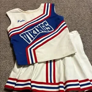 Blue and white Vikings cheerleader uniform with red accents. Includes top and skirt.