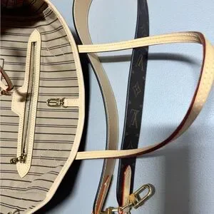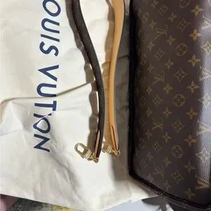 Elegant Louis Vuitton tote with iconic monogram pattern. Features brown leather and tan handles. Perfect for everyday use.