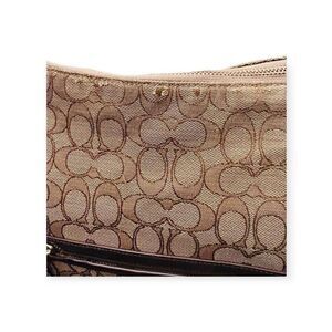 Stylish Coach shoulder bag. Features signature pattern. Tan body with black accents. Gold chain details. Light wear, overall in good condition. See photos. Loved it but ready to let go of it for something else. Offers welcome! ☺️🤍
