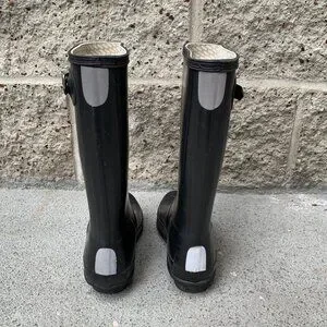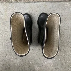 Scuffs and cracks on rubber near toe and shaft; still functional. There is a name and phone number written inside of both boots.