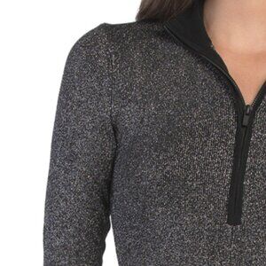 metallic finish, embroidered detail, contrast collar, quarter zip front, fabric provides stretch
