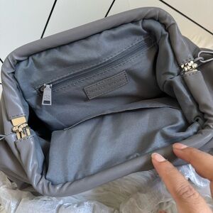 It is made of vegan faux leather and features a tone-on-tone logo plaque. Has removable crossbody strap and is lined with pockets.
