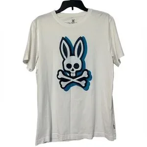 Excellent condition men’s Psycho Bunny white graphic tee—size “5” medium (see size chart in photos).