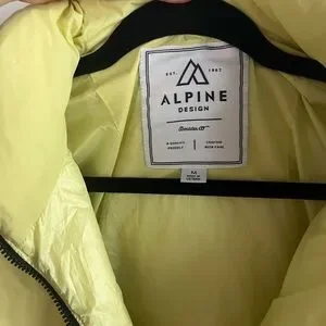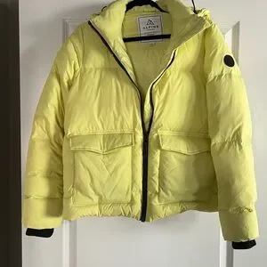 Light yellow jacket with a hood. Features a front zipper and two pockets.