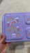 Purple lunchbox with colorful rainbow design. Features multiple compartments, stainless steel. some faint rub marks on the lid from storage, but new, never used. approx 10” x 7.5” x 2”