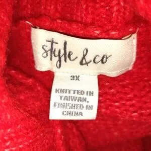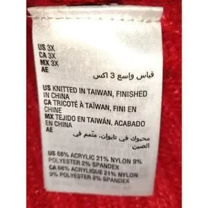 Women's SIZE 3X. 68% Acrylic/21% Nylon/9% Polyester/2% Spandex. Machine Wash/Tumble Dry. Knitted in Taiwan, Finished in China.