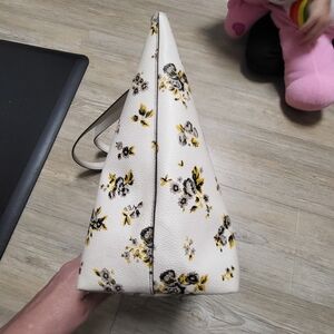 Stylish shoulder bag with floral pattern. Features elegant cream and yellow design. Ideal for everyday use.