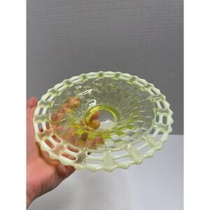 Fenton Basketweave Canary Yellow Opalescent Glass Bowl 7in Two Row Pierced Edge