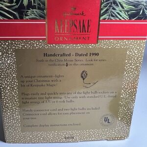 The Hallmark 1990 Chris Mouse Wreath Christmas Series Magic Light Ornament is a vintage collectible ornament from the Hallmark brand. This unique ornament features a mouse shape with the character of Chris, and includes lights that illuminate the wreath design. Perfect for Christmas enthusiasts and collectors, this Hallmark ornament from 1990 brings a festive and nostalgic touch to any holiday decor.