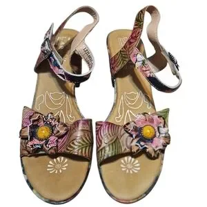 L'ARTISTE Spring Step Leilanie slingback multicolor platform leather sandals with velcro straps. Step into style with these vibrant floral sandals by L'ARTISTE. Perfect for adding a pop of color to any outfit. Gently worn a couple of times.