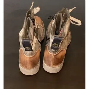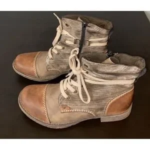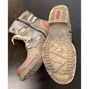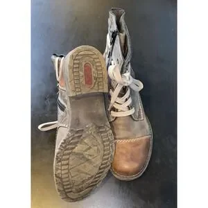 The Reiker Peyton Graphic Print Side Zip Combat Boots in size 38 (US 7.5-8) are a stylish and functional choice for women looking for a versatile footwear option. Made with high-quality leather, these brown boots feature a convenient side zip closure and a classic combat style design. The Reiker brand ensures durability and quality, making these boots a reliable and fashionable choice for everyday wear.