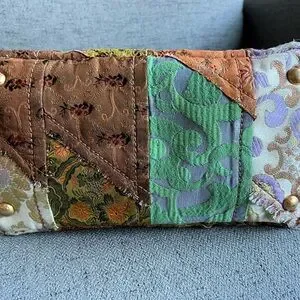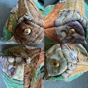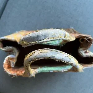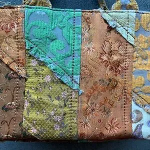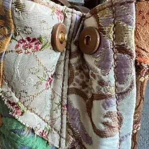 Only one like this under $1000 on poshmark. Limited edition collectible Prada bag. Released in 2015 this edition was part of the runway collection matching coats. Multicolor silk embroidered fabric cover the bag in a patchwork design. Comes with leather shoulder strap and gold hardware. Some stains are present in the interior lining, rubbing on the corners and handles as shown. This tote bag showcases a vibrant blend of orange and green in an abstract, painterly style. Crafted from a sturdy, textured fabric, it offers a unique artistic flair with its structured rectangular shape and short handles.