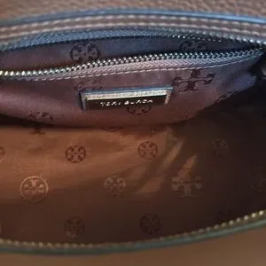 Tory Burch Theo crossbody satchel in tan leather.