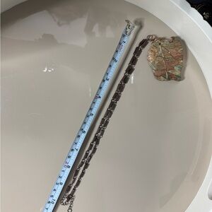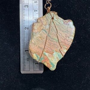 Raw Jasper with banded hues of mauve, cream and greens. Wrapped with copper wire. Unique chain with boxy links. Lobster clap.