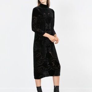 ZARA Black Burnout Print Velvet Mock Neck Midi Dress
