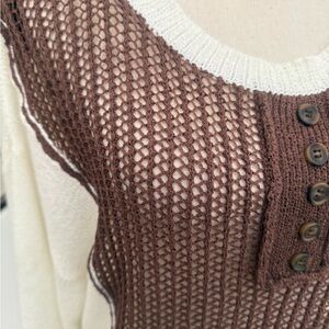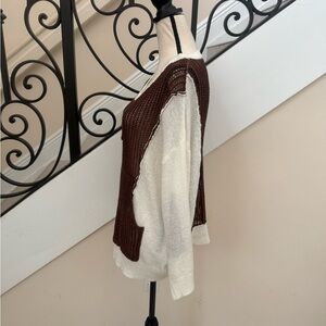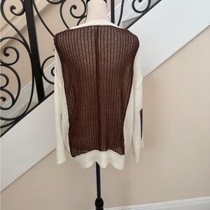 Elegant open knit sweater with a kangaroo pocket and elbow pads with a brown and cream sleeves. Features button detail on the front. NWOT