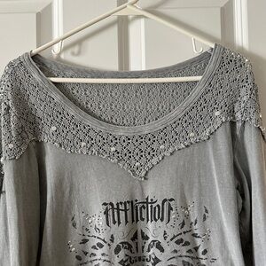 Affliction gray long sleeve shirt with intricate lace accents. Features bold studded graphic design.