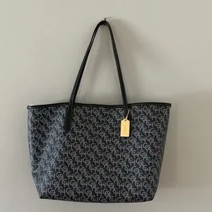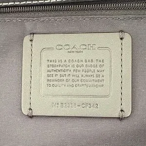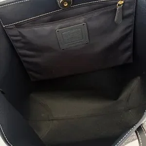 Sophisticated Coach tote with signature pattern. Black handles and trim. Ideal for daily use.
