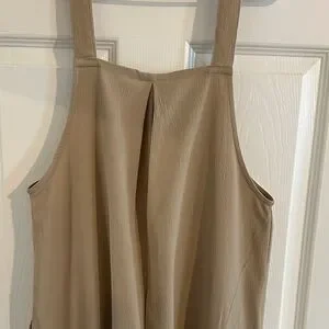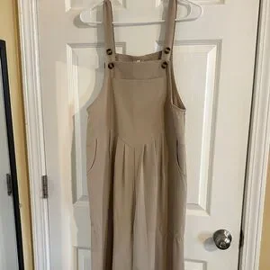 Stylish beige overall pants featuring button details and pockets. Perfect for casual outings.