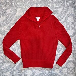 Bright red knit sweater with a half-zip design. Ideal for cool weather and holiday cheer.