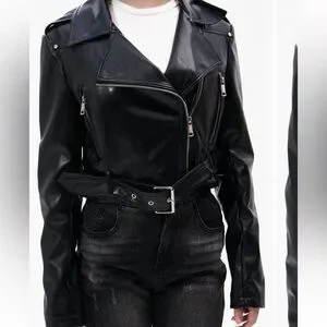 Elevate your style with this chic black leather biker jacket. Perfect for a bold, edgy look.
