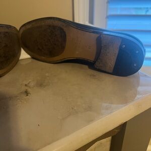 Elegant black leather loafers with a striking gold accent. Ideal for any occasion.