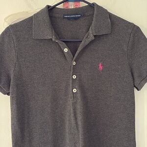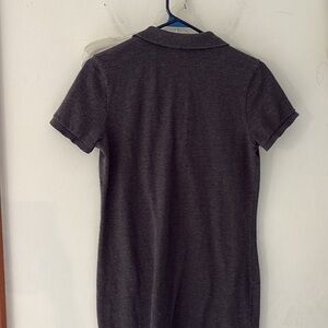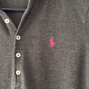 Size L, but runs small. Dark grey with pink polo. Bust is around 20” flat, length is around 35”.
