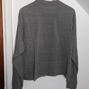 Our signature (slightly) cropped long sleeve tee, the perfect jean skimming length with a raw edge hemline and boxy fit. 50% polyester/38% cotton/12% rayon. Raw Hem. Size: S. Chest width: 22 1/4. Approx length 22".