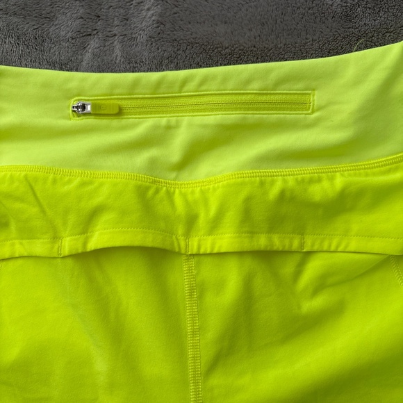 Bright neon yellow Lululemon Speed Up shorts, perfect for running or workouts. Lightweight, breathable fabric with a built-in liner for comfort and coverage. Features a wide waistband with interior pocket for small essentials.