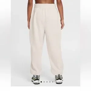 Experience ultimate comfort with these Nike joggers, featuring a relaxed fit and elastic cuffs for a sporty look. The cream color is complemented by a bright yellow logo, adding a touch of style to your athleisure wardrobe. Perfect for casual outings or lounging, these sweatpants offer a soft, textured feel.