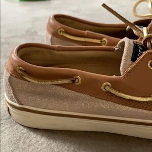 These are Sperry top-siders with a leather upper and gold flecks on the lighter part. The laces are painted gold on one side so they look really great against the brown other side. They do show some wear as they were well loved but they still have lots of life left in them.