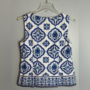 Sleeveless blouse with two buttons on each shoulder. Has a side zipper. 100% cotton lined with white cotton fabric. Armpit to armpit 18 1/2” Length 23” Excellent condition