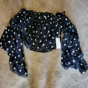 Stylish black top with white polka dots. Off-shoulder design with long sleeves. tag attached
