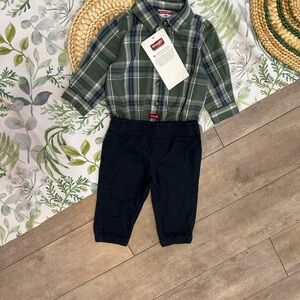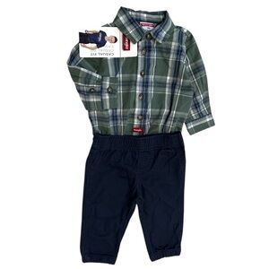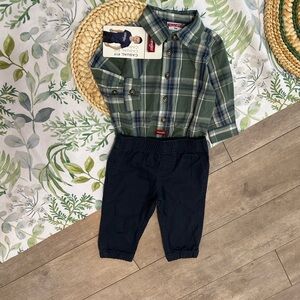 New Wrangler Baby Boy Outfit Set Plaid Button Bodysuit & Navy Khaki Pants Size 9 month baby boy