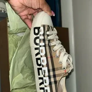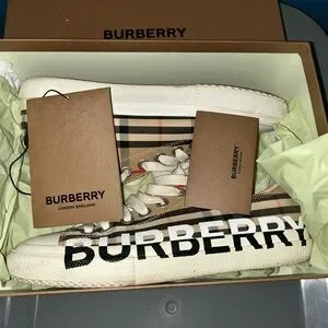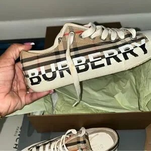 Chic high-top sneakers with classic Burberry plaid. Bold logo across the side. Perfect for casual wear.