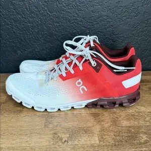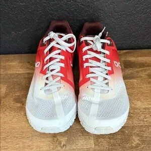 Stylish red and white athletic sneakers with lace-up design. Perfect for running or casual wear.