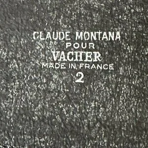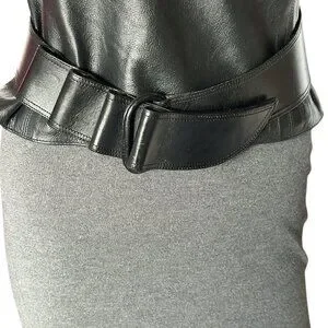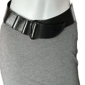 Pristine Black leather Claude Montana Belt. The "loop ridges/notches" on the belt are multiple places clasp may be placed allowing for multiple adjustments. Belt is 33" length with adjustments for waist fit of 29" 28" 27" 26" depending on which "notch/loop" place clasp. May be worn at waist or "draped" look as belt slopes from back to front. Width in back is 3" sloping to 2" width in front. Sturdy Leather. Made in France.