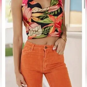 Gorgeous tropical floral crop top with open back, tie back adjustable halter neckline, and beautifully draped cowl. See other ad for matching pants! Can send me an offer to combine 💗
