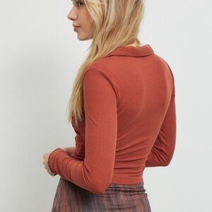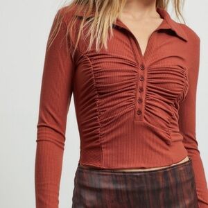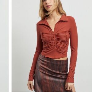 UO Rust Orange Aries Ruched Long-Sleeve Blouse Top Henley