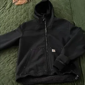 Durable and warm Carhartt jacket. Ideal for outdoor adventures. Features a hood and front pockets. worn once