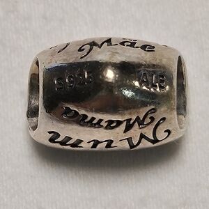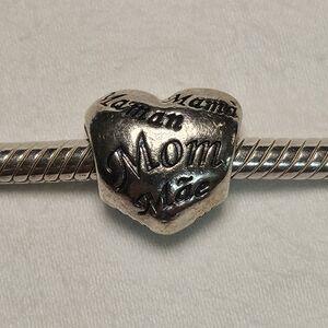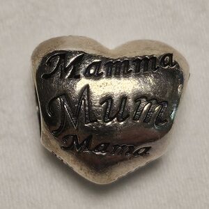 The "A Mother's Heart" charm is made with Sterling Silver, and is in the shape of a heart. This charm says "MOM" in 8 different languages: US English, UK English, Danish, German, Spanish, Italian, Portuguese and French.