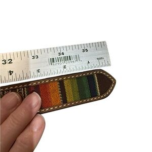 Stylish Nocona belt with vibrant serape stripes. Features an ornate silver buckle. Perfect for any outfit in an adult size 28 like new condition.